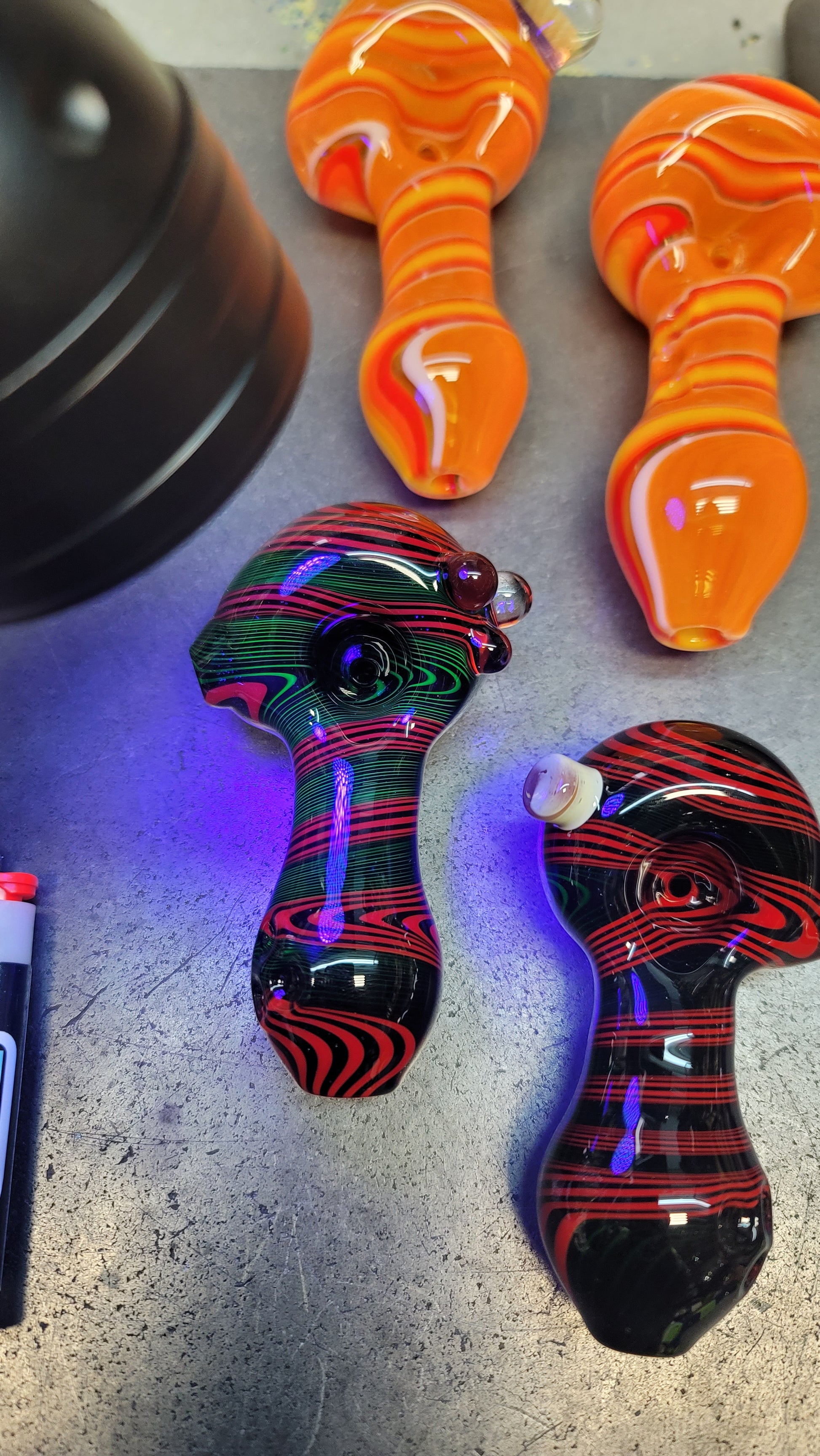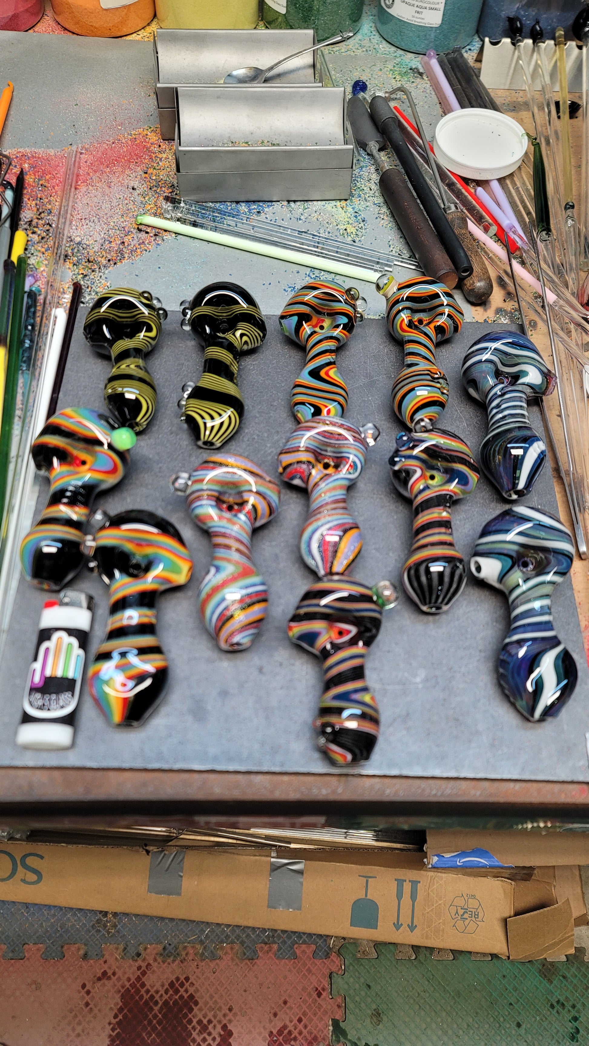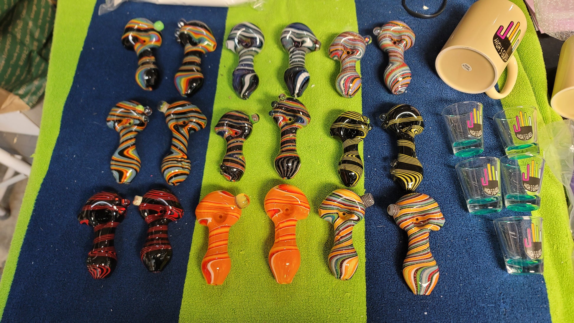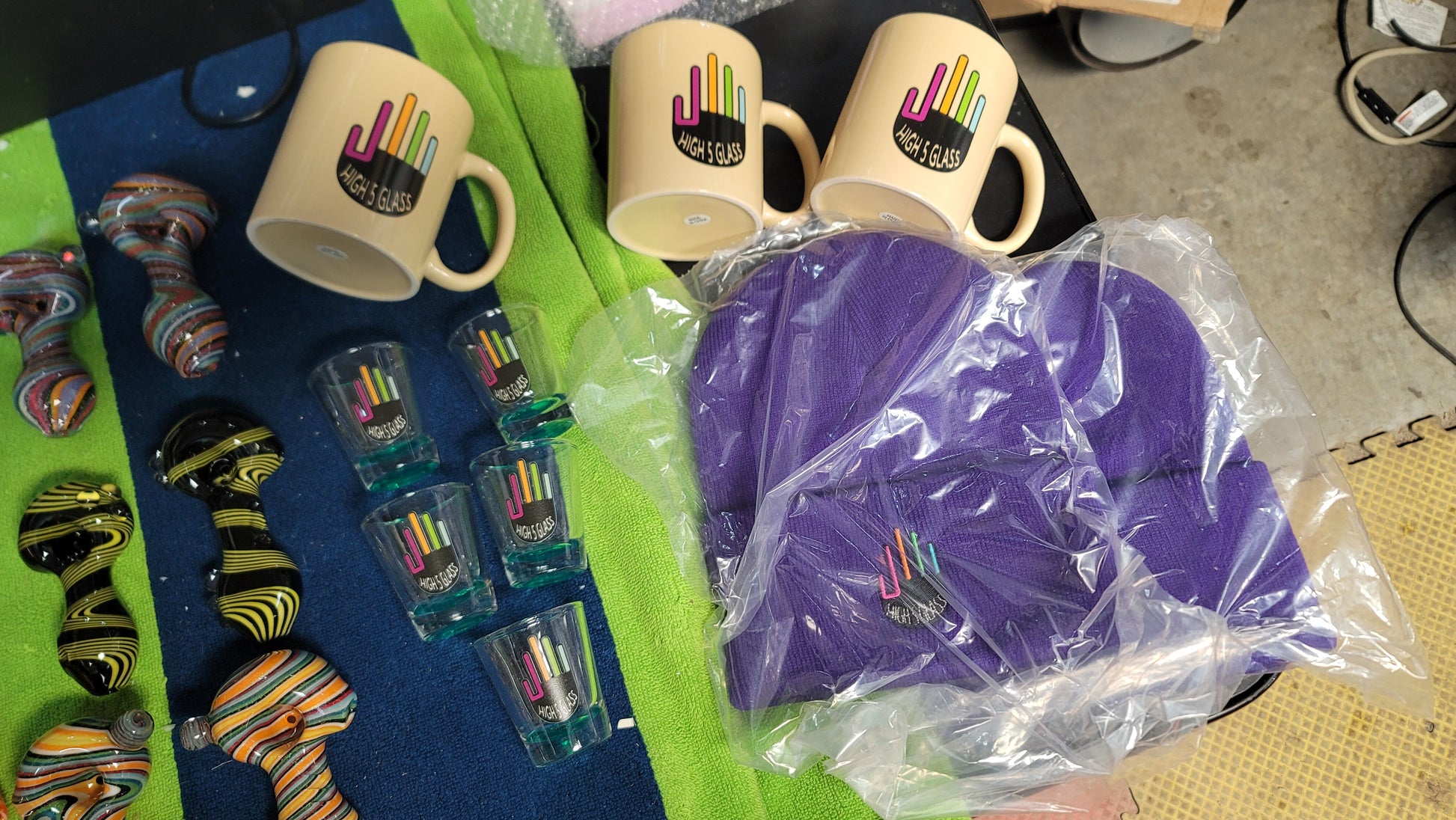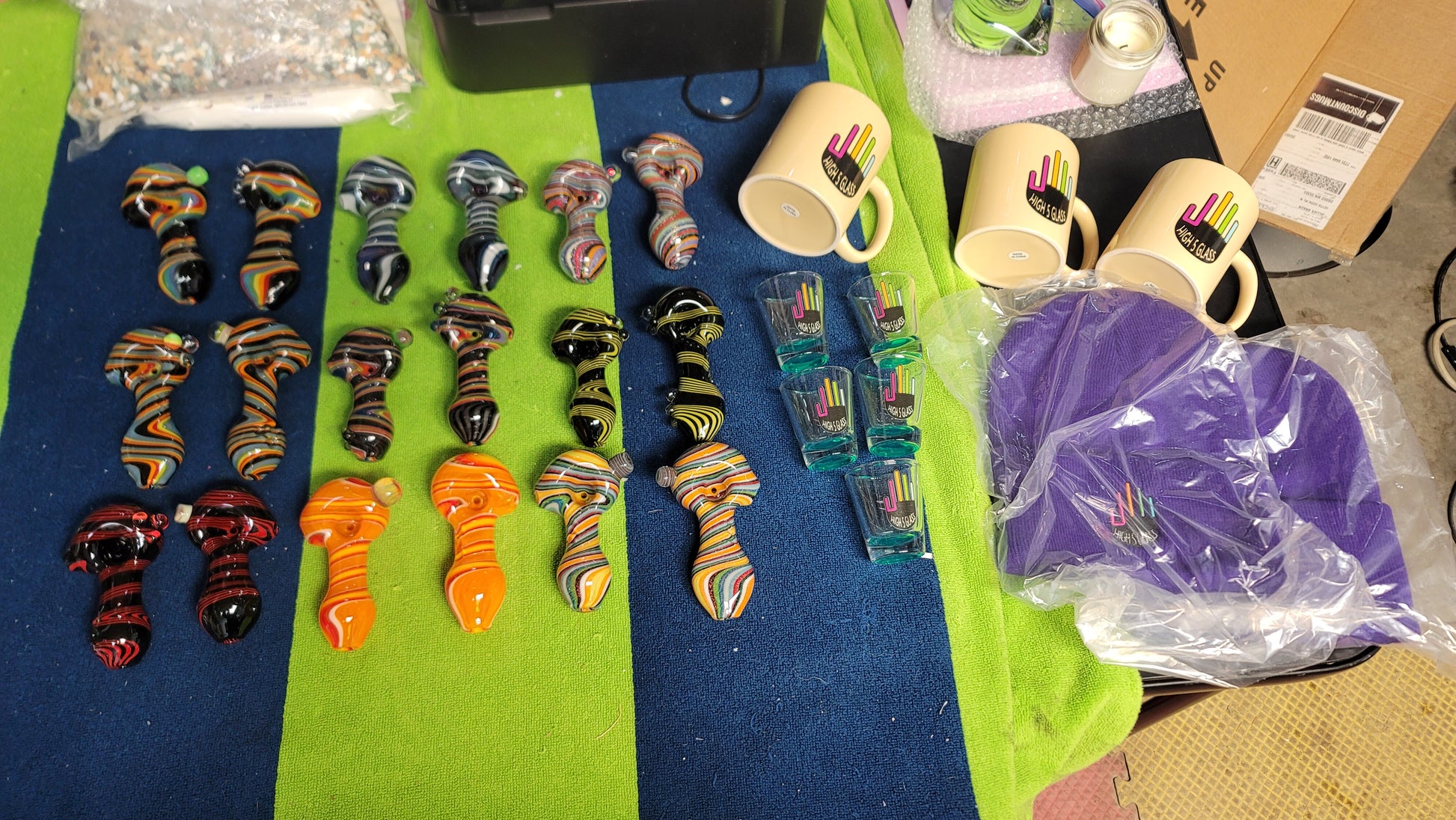 Every mystery box is guaranteed to come with at least one pipe and two stickers. You might get a piece of merchandise as a bonus! (Purple hat, mug or shot glass)