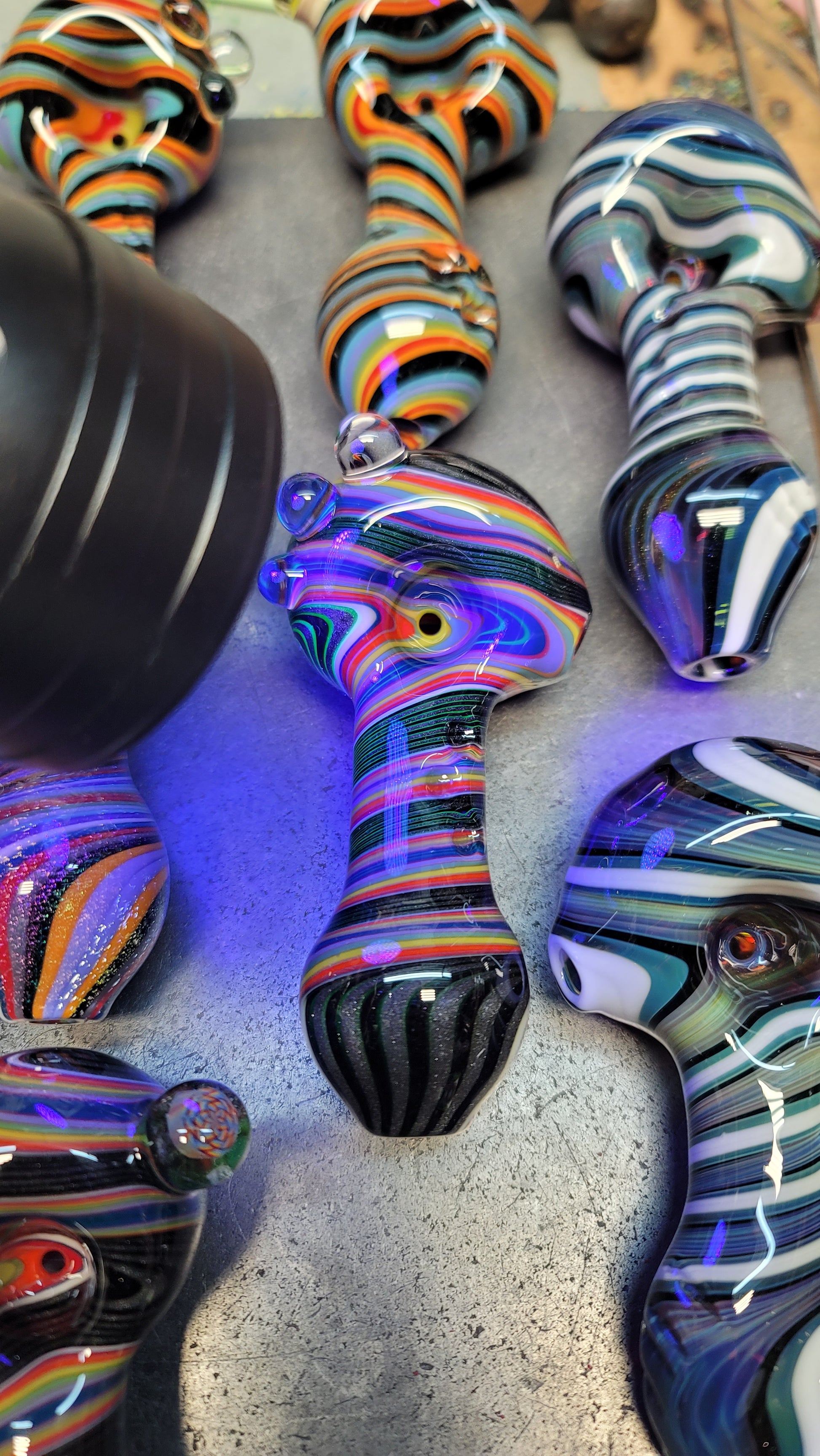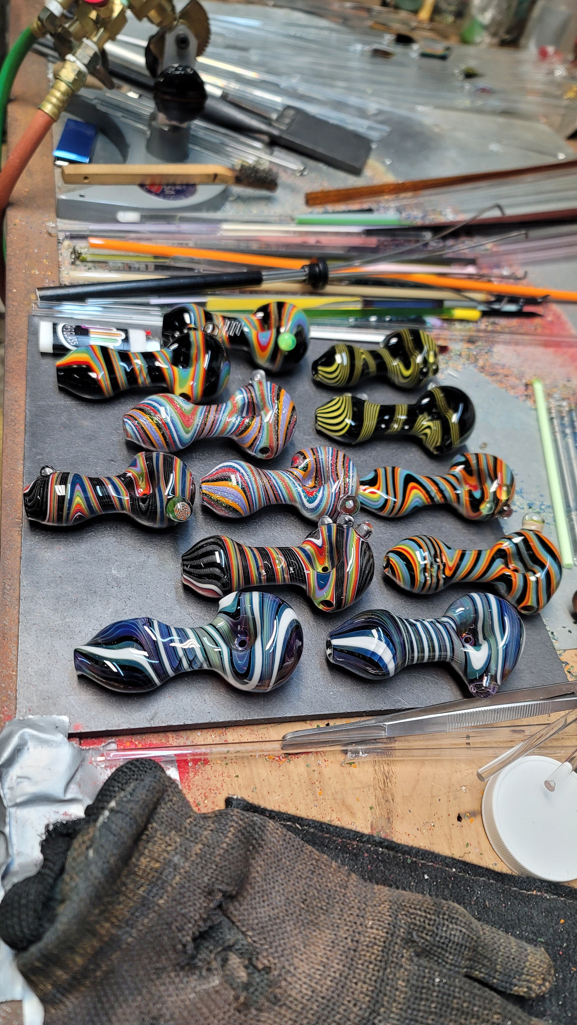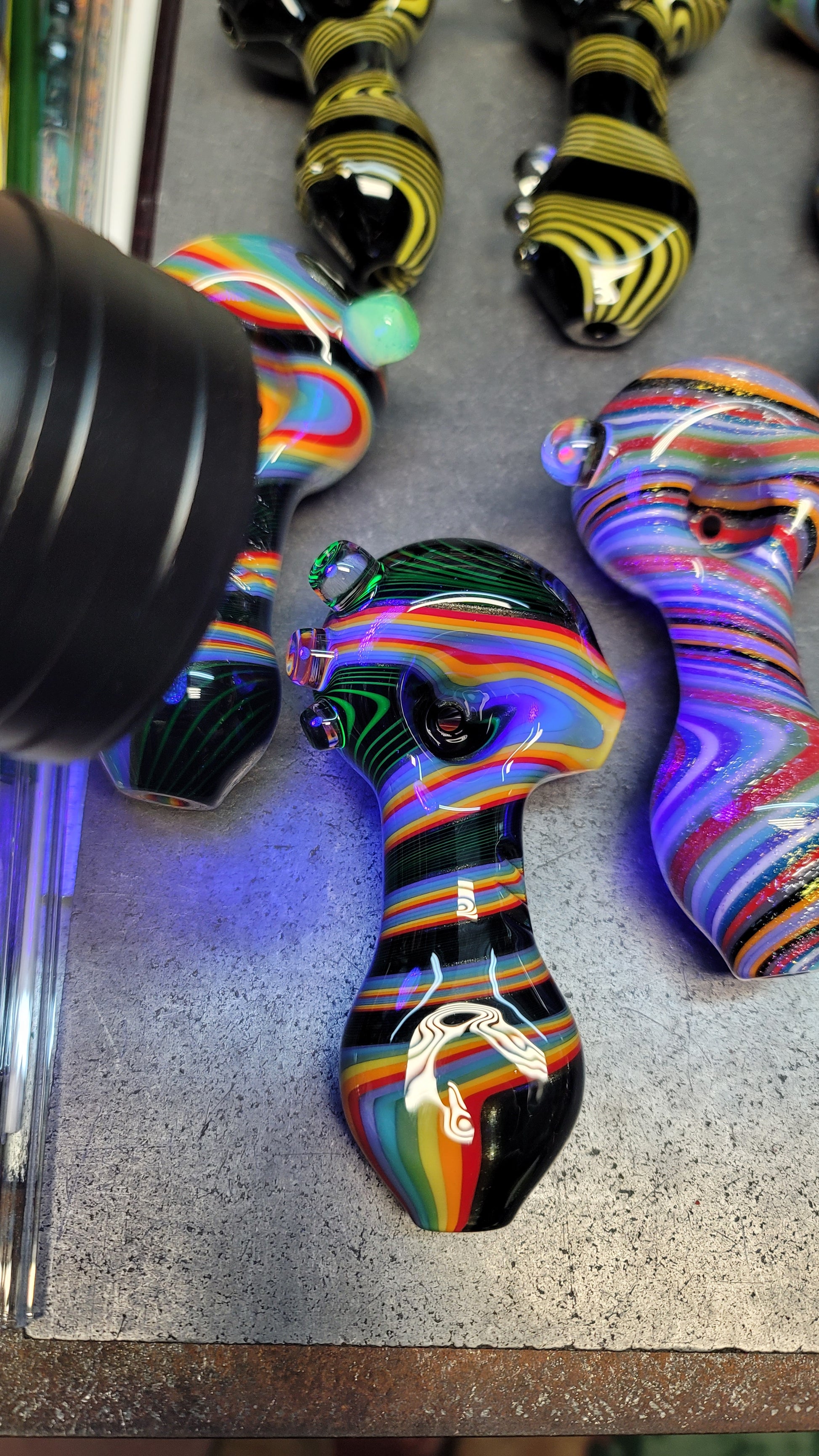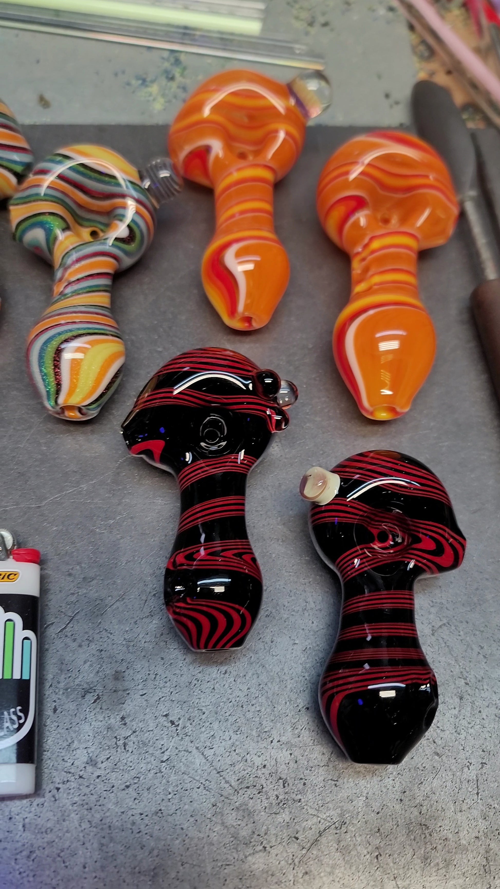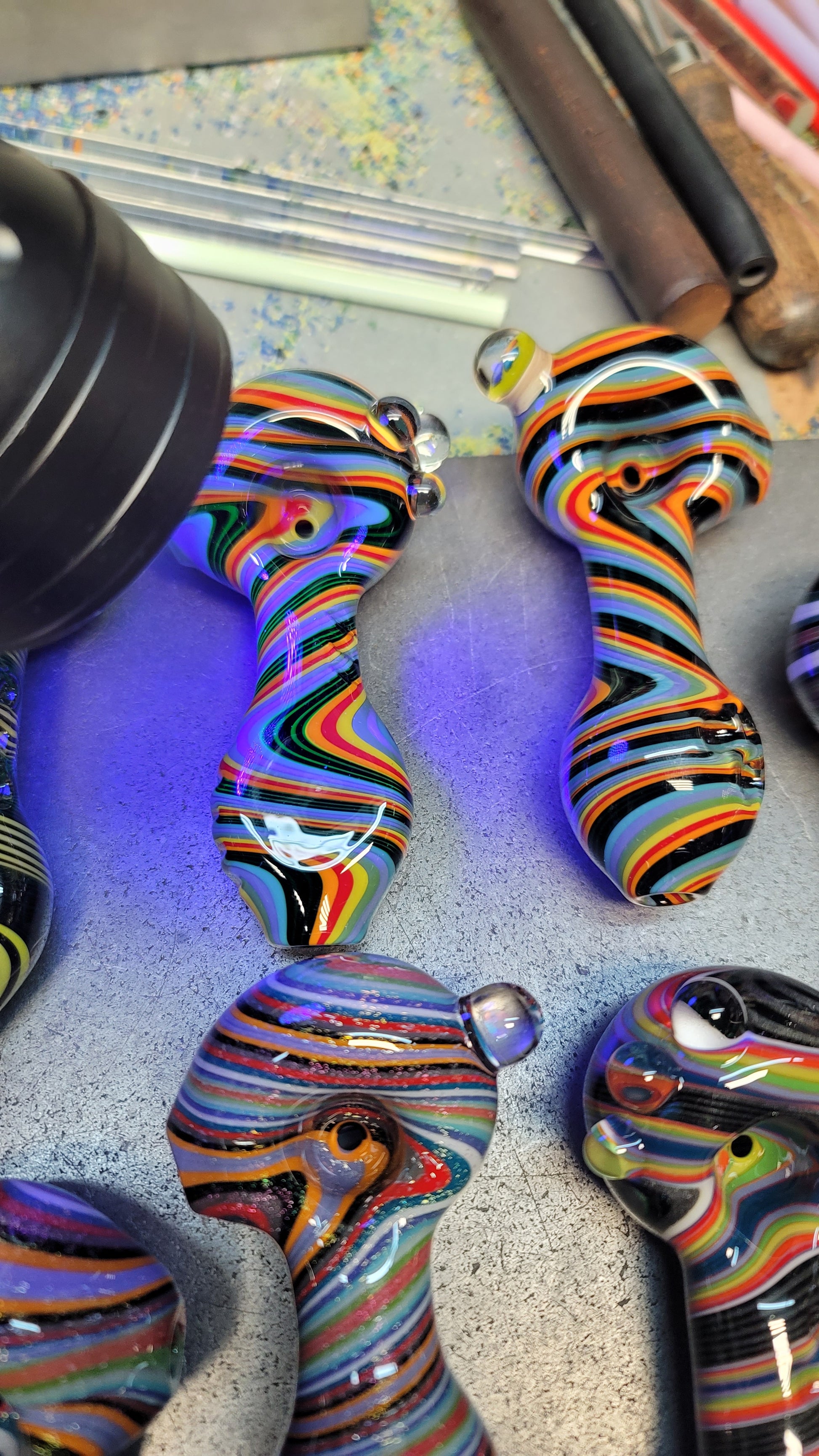 Every mystery box is guaranteed to come with at least one pipe and two stickers. You might get a piece of merchandise as a bonus! (Purple hat, mug or shot glass)
