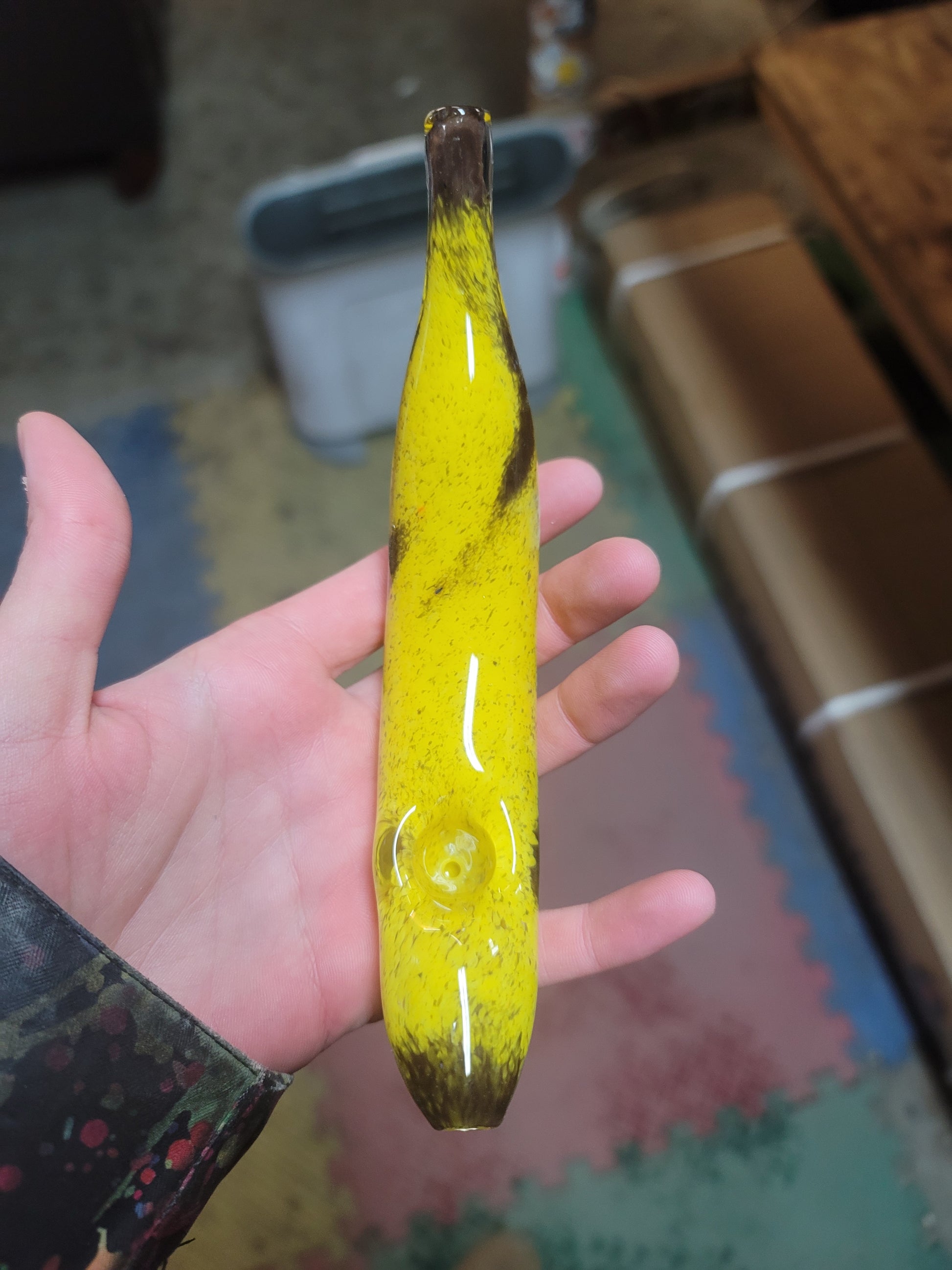 One very thick hand blown banana pipe. Message me if you'd like anything different. Made and shipped within two weeks of ordering.