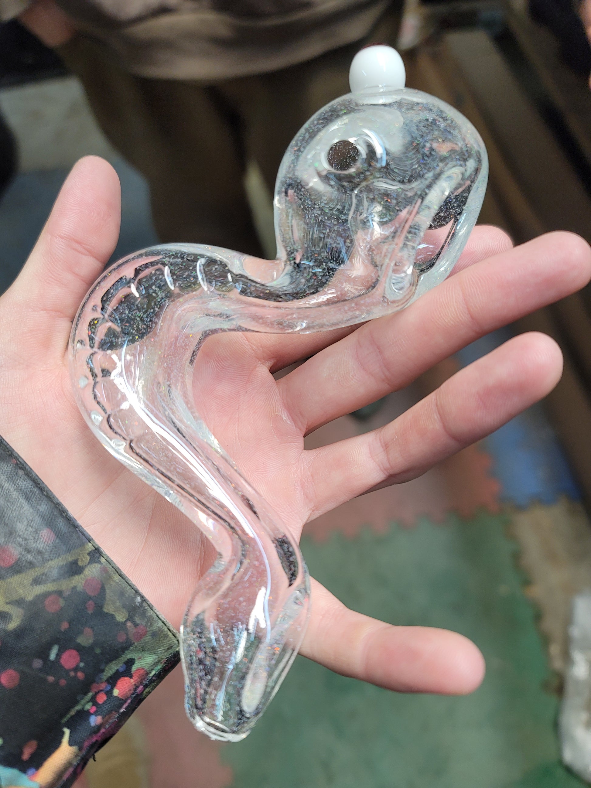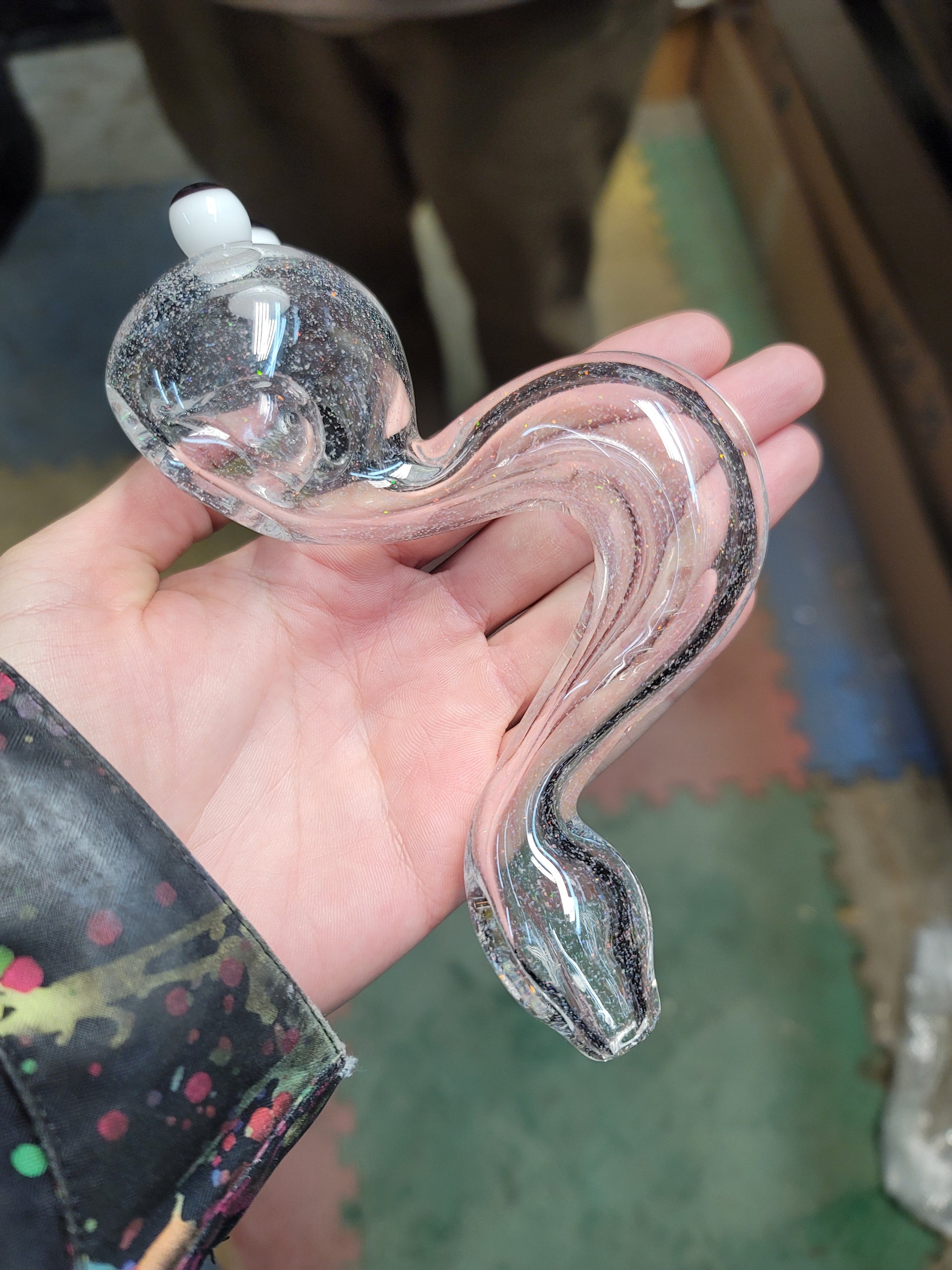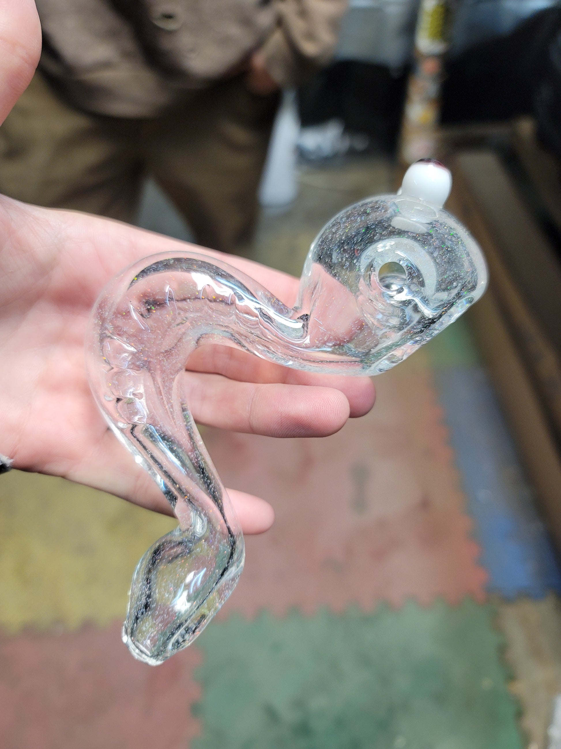 Very thick hand blown glass. Almost half a pound of glass used in this piece. Cropal is crushed opal and it's scattered throughout the pipe. Cropal tube made by Acadian Glassworks.