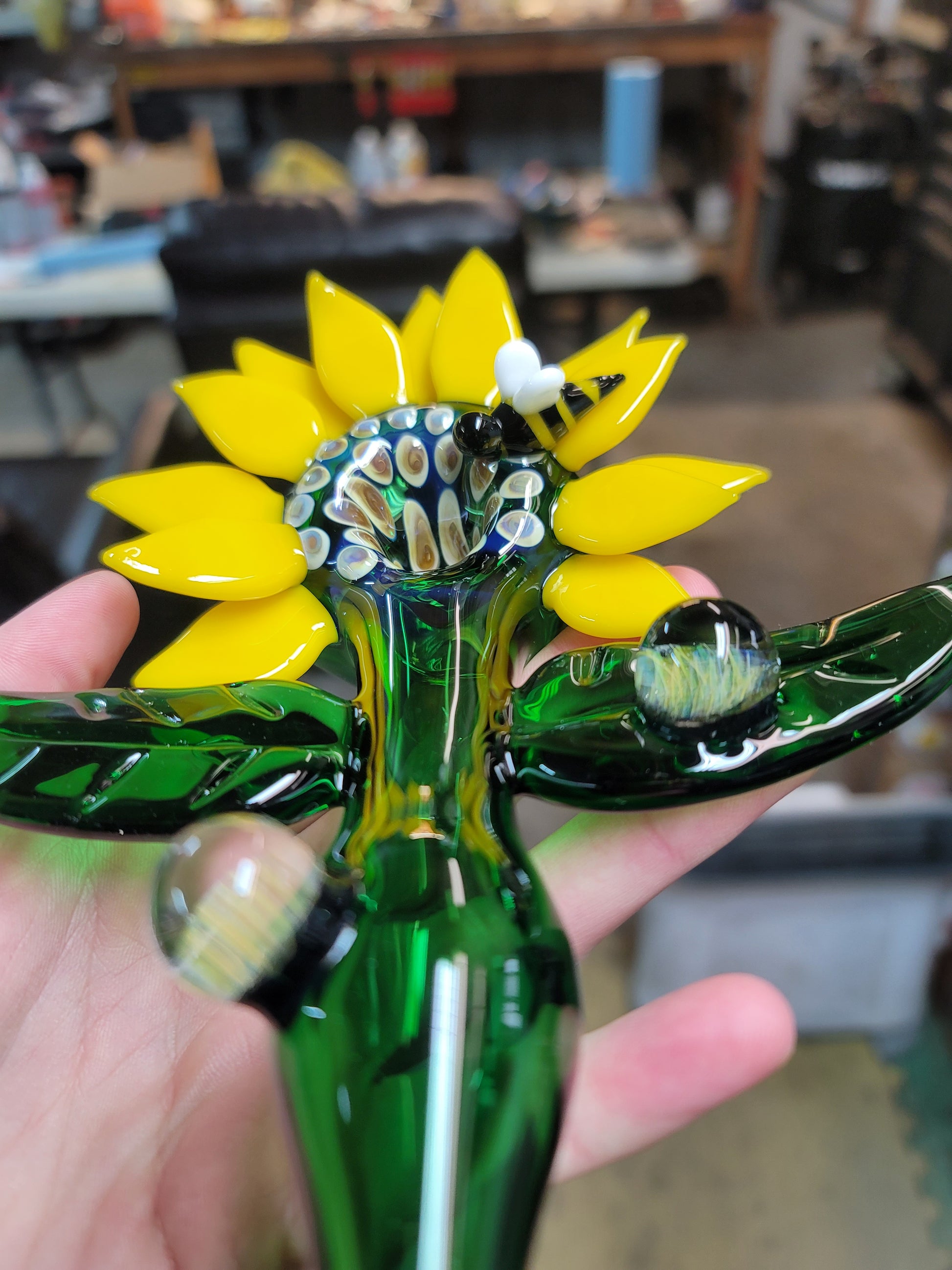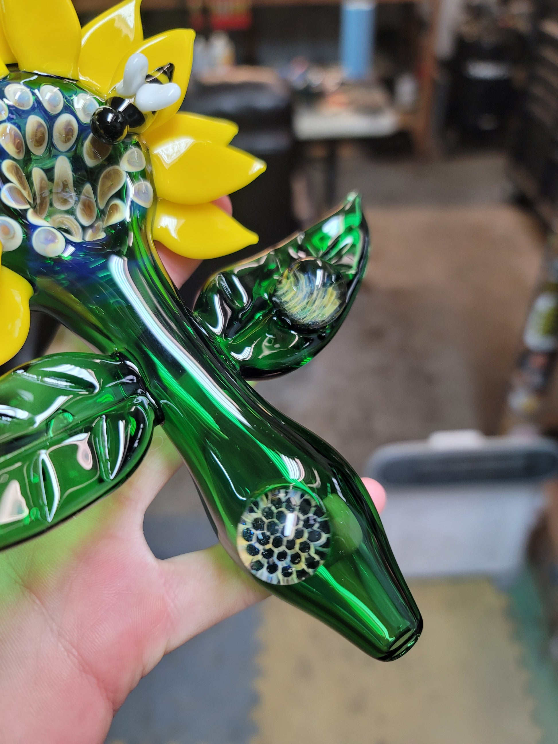 Made to order sunflower pipe. Very thick hand blown glass. Made and shipped within two weeks of ordering.