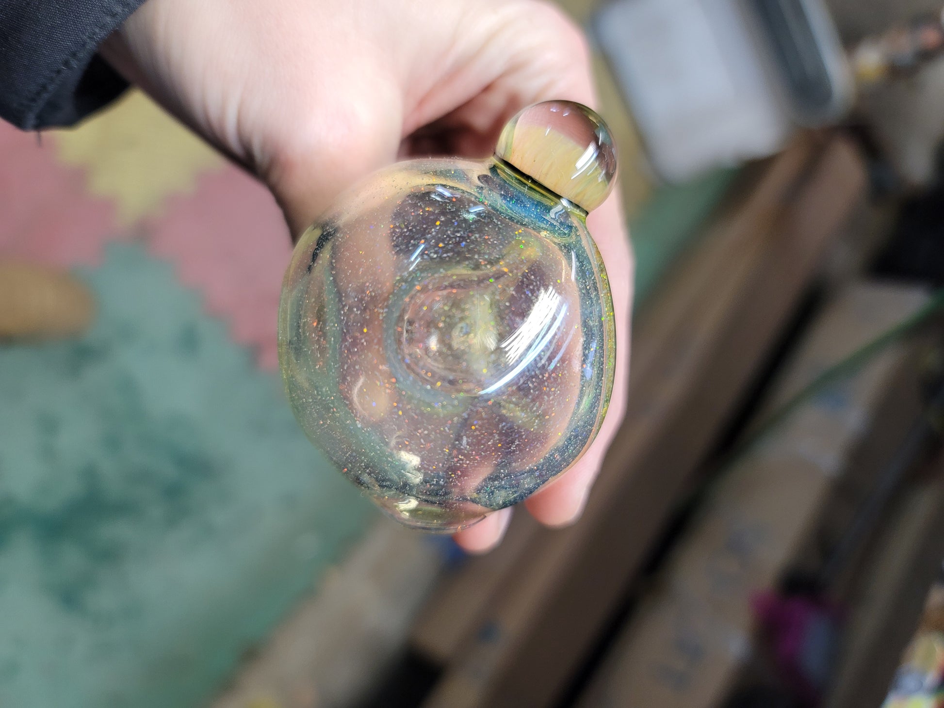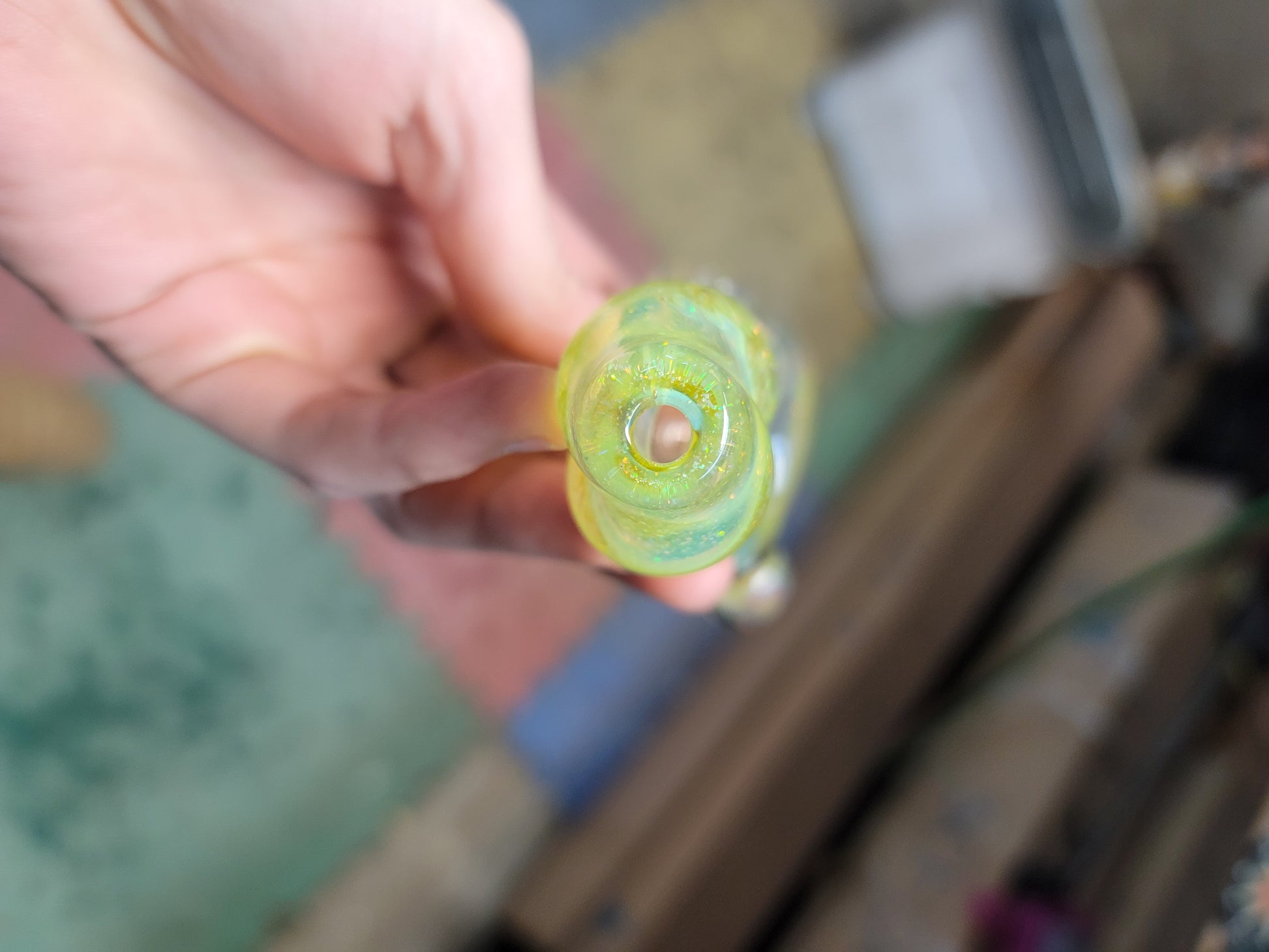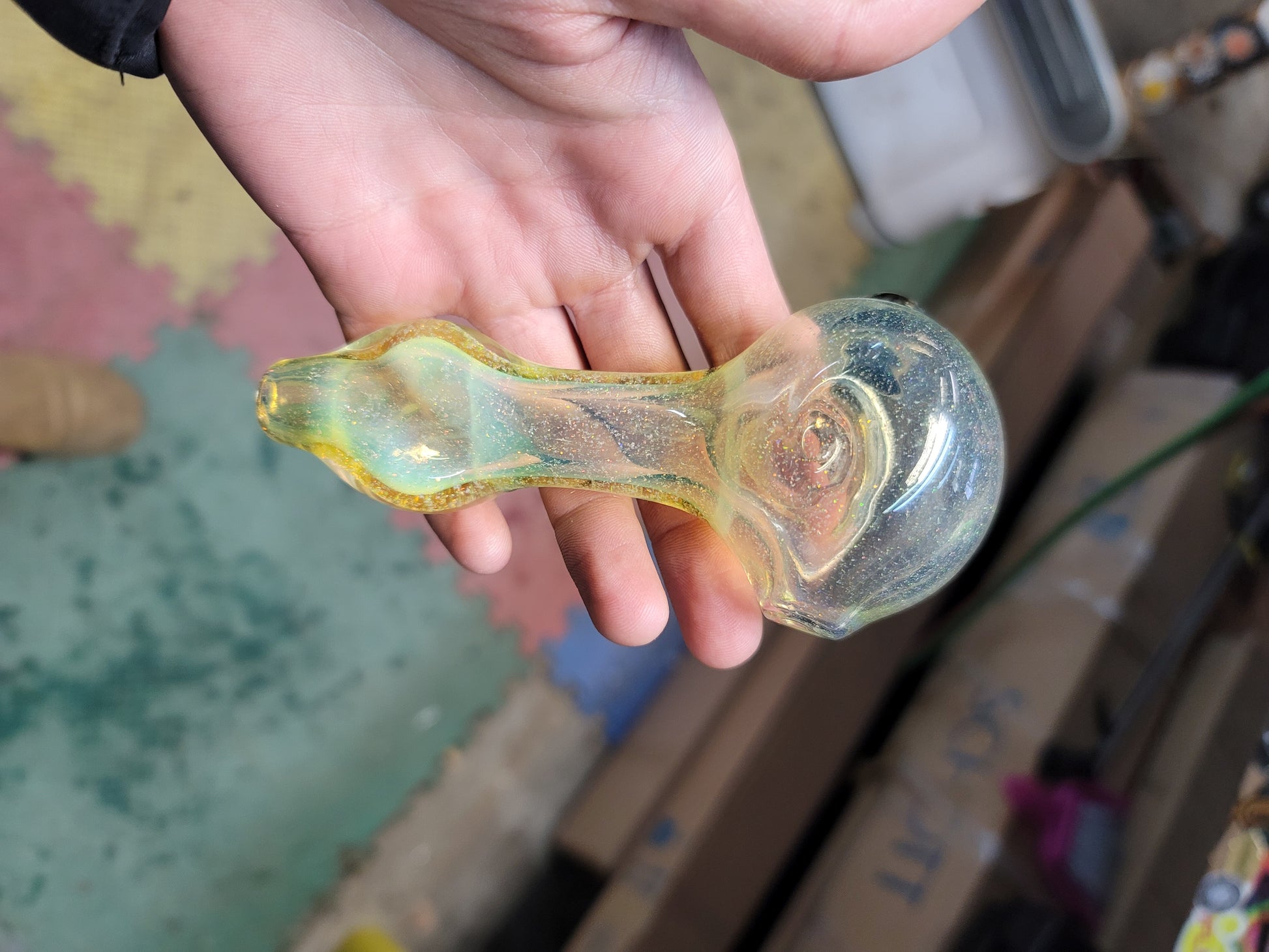 Very thick hand blown crushed opal glass pipe. Color made by Acadian Glassworks. Honeycomb milli made by Colorado Color Company.