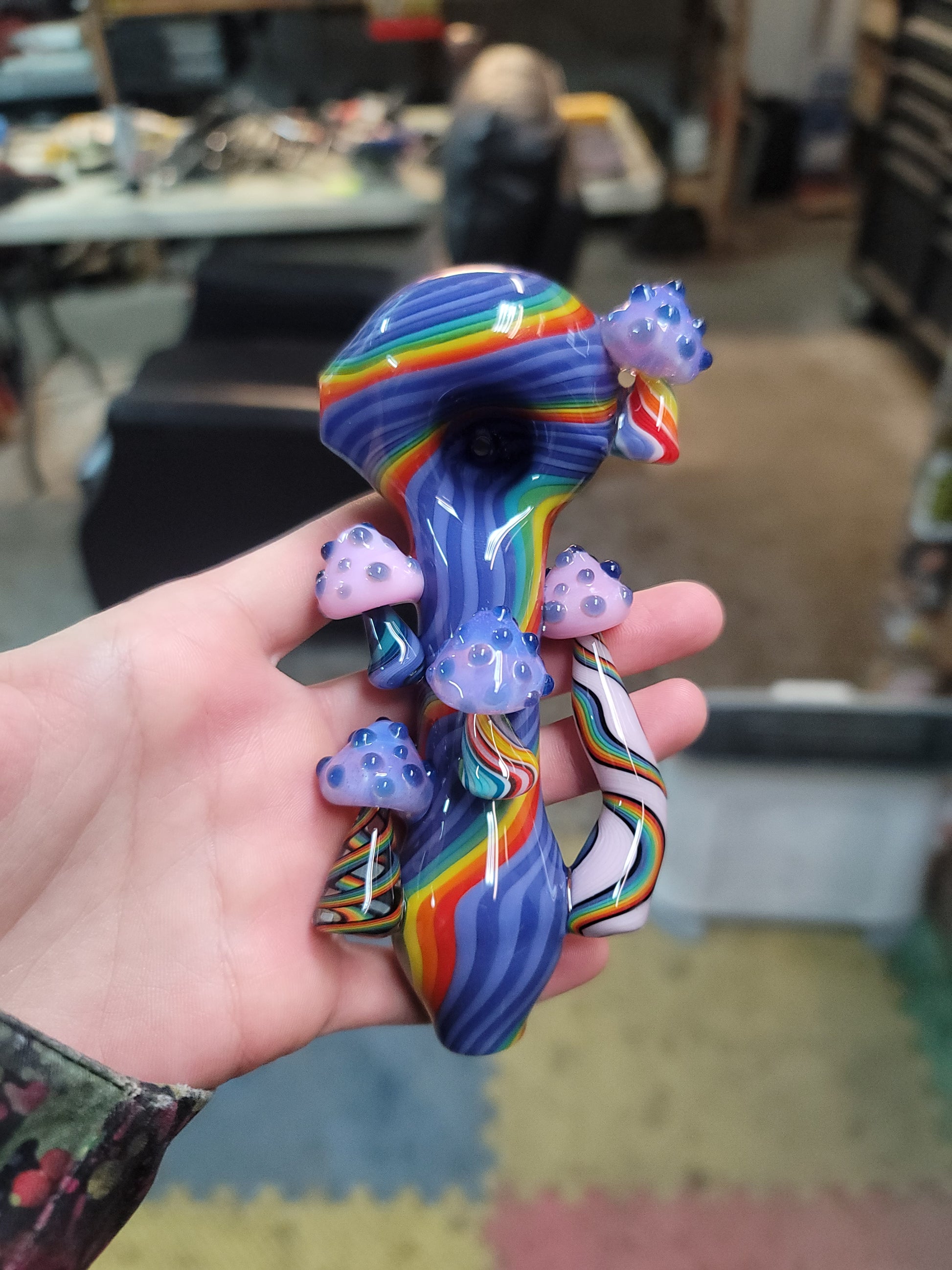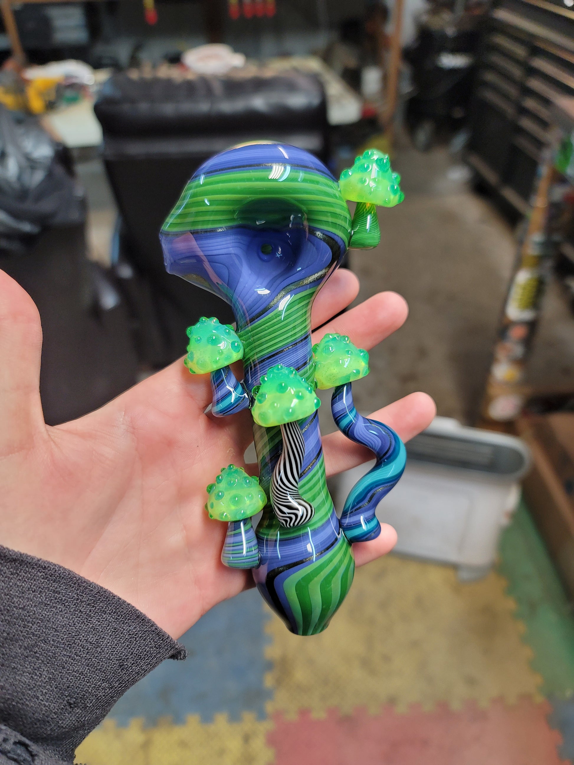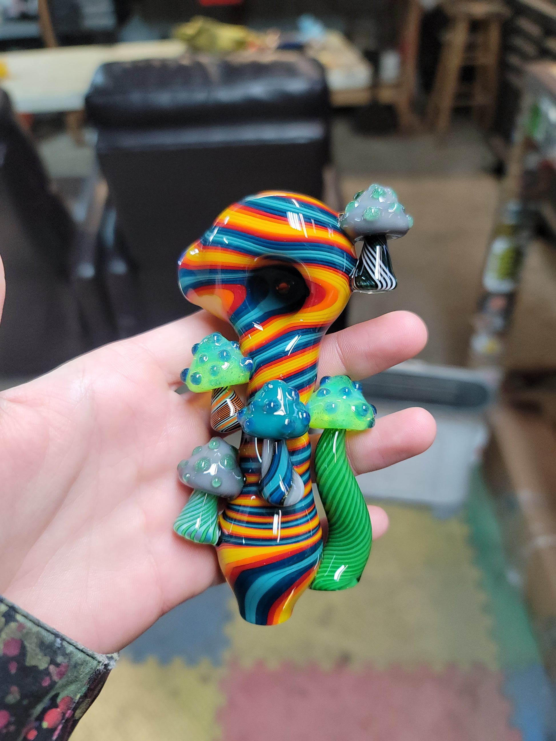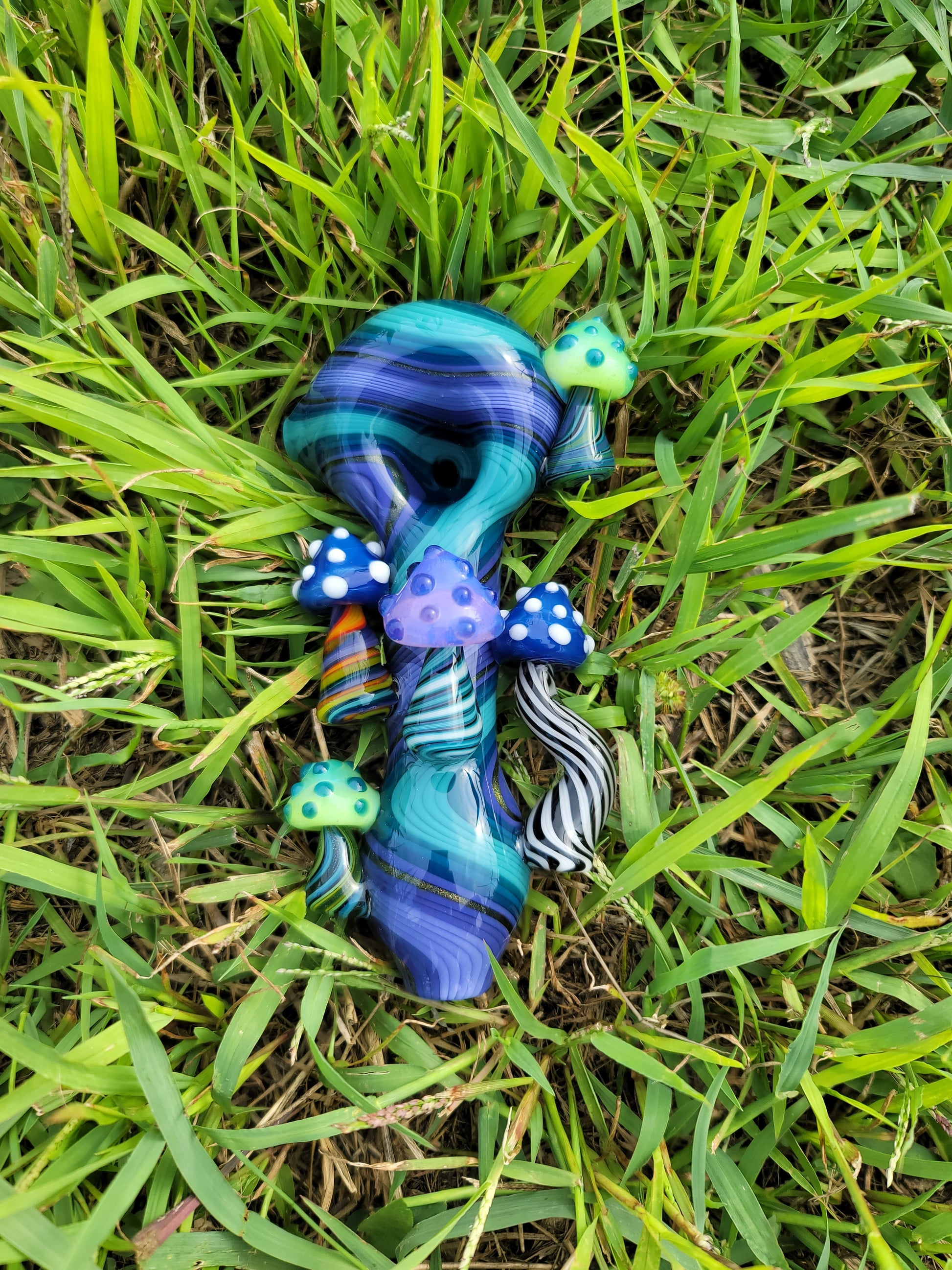 One of a kind very thick hand blown glass. Made and shipped within 2 weeks of ordering. You pick the colors. Message me to discuss the colors you'd like. There's another option for 3 mushrooms.