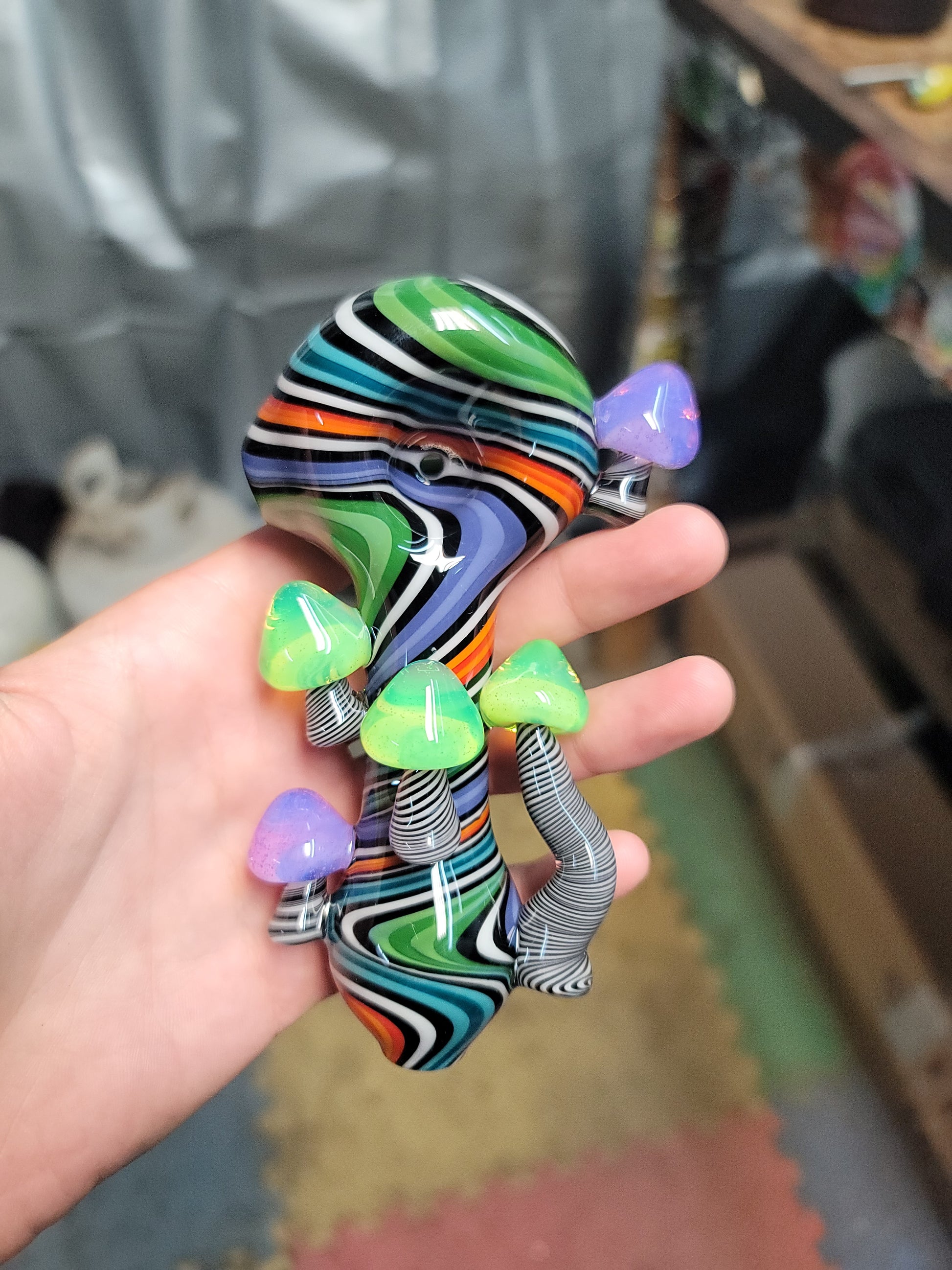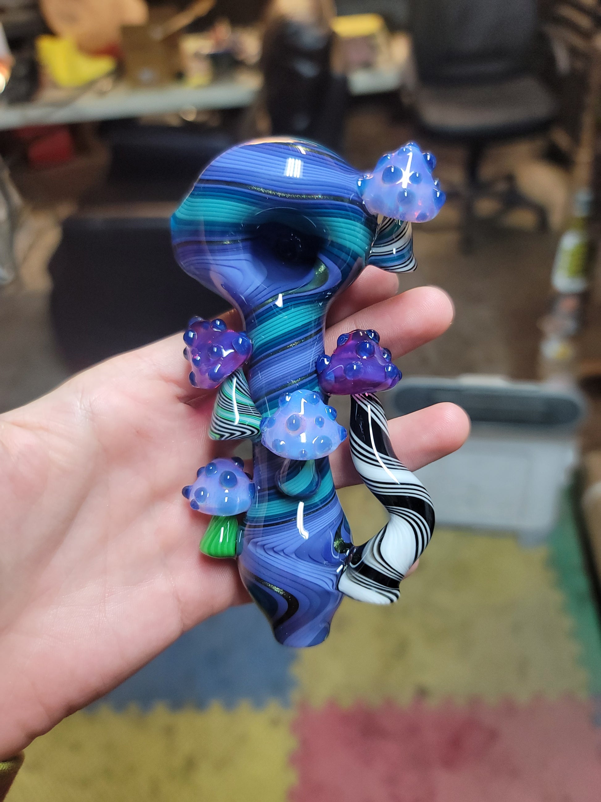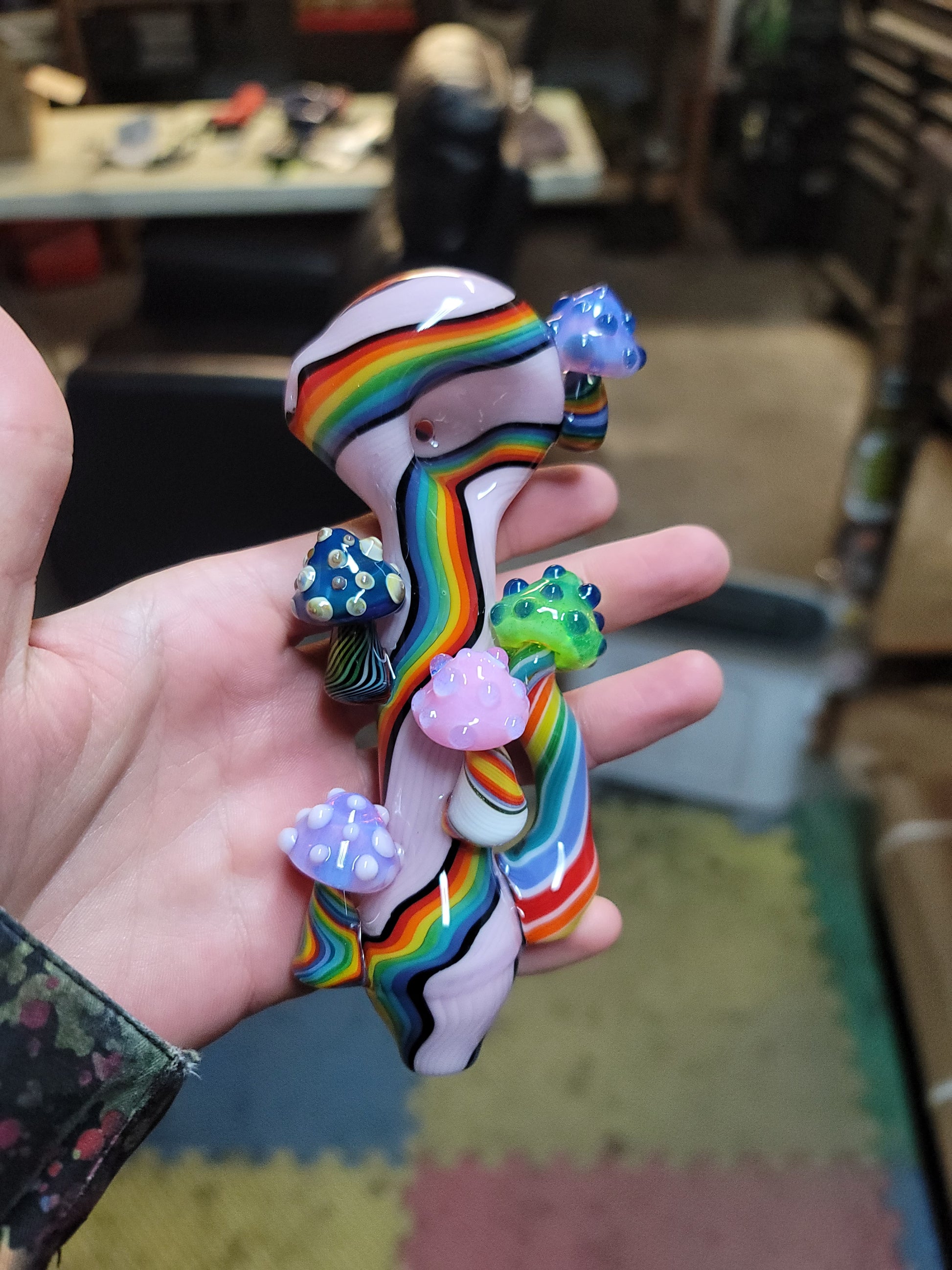 One of a kind very thick hand blown glass. Made and shipped within 2 weeks of ordering. You pick the colors. Message me to discuss the colors you'd like. There's another option for 3 mushrooms.