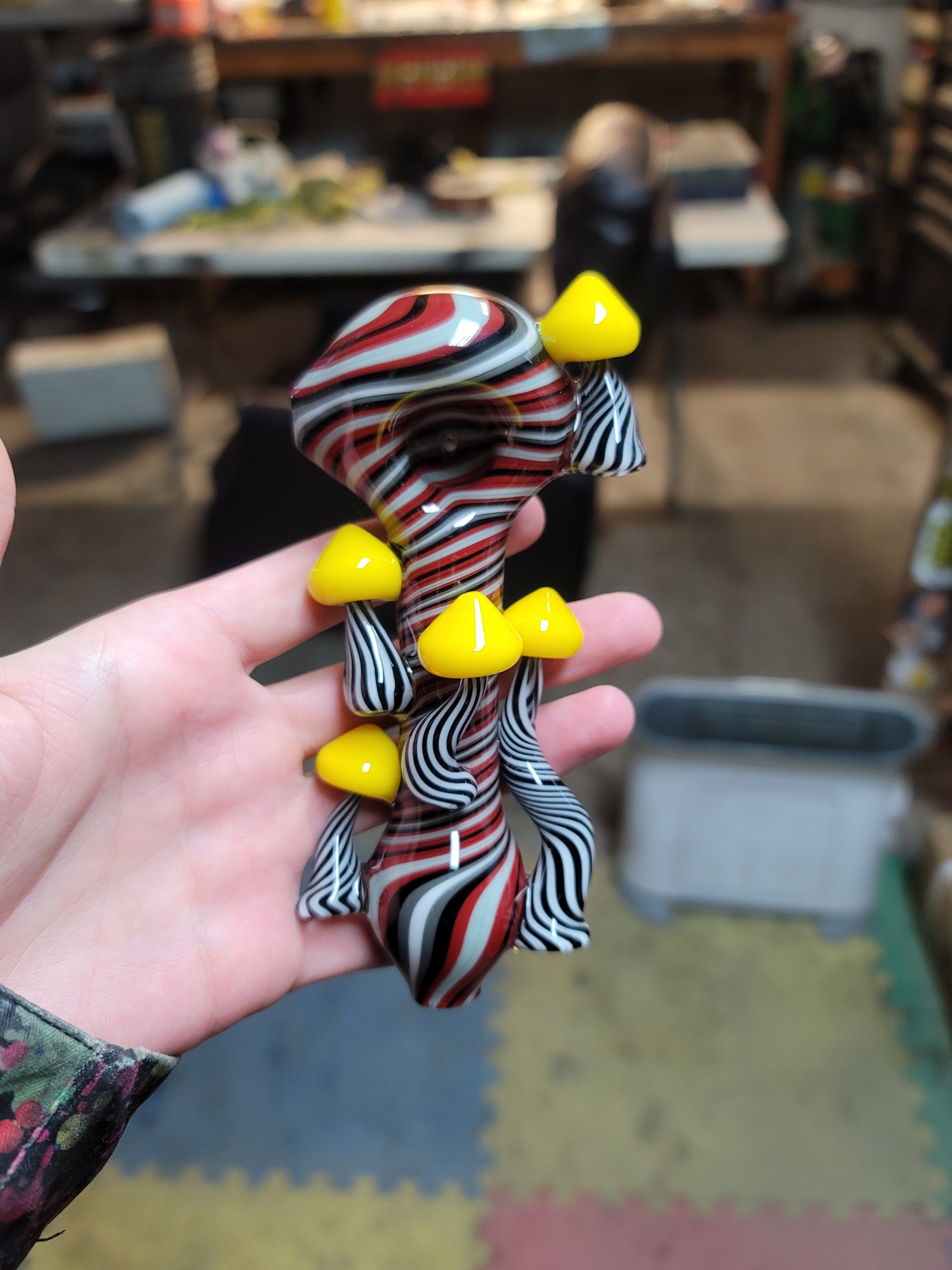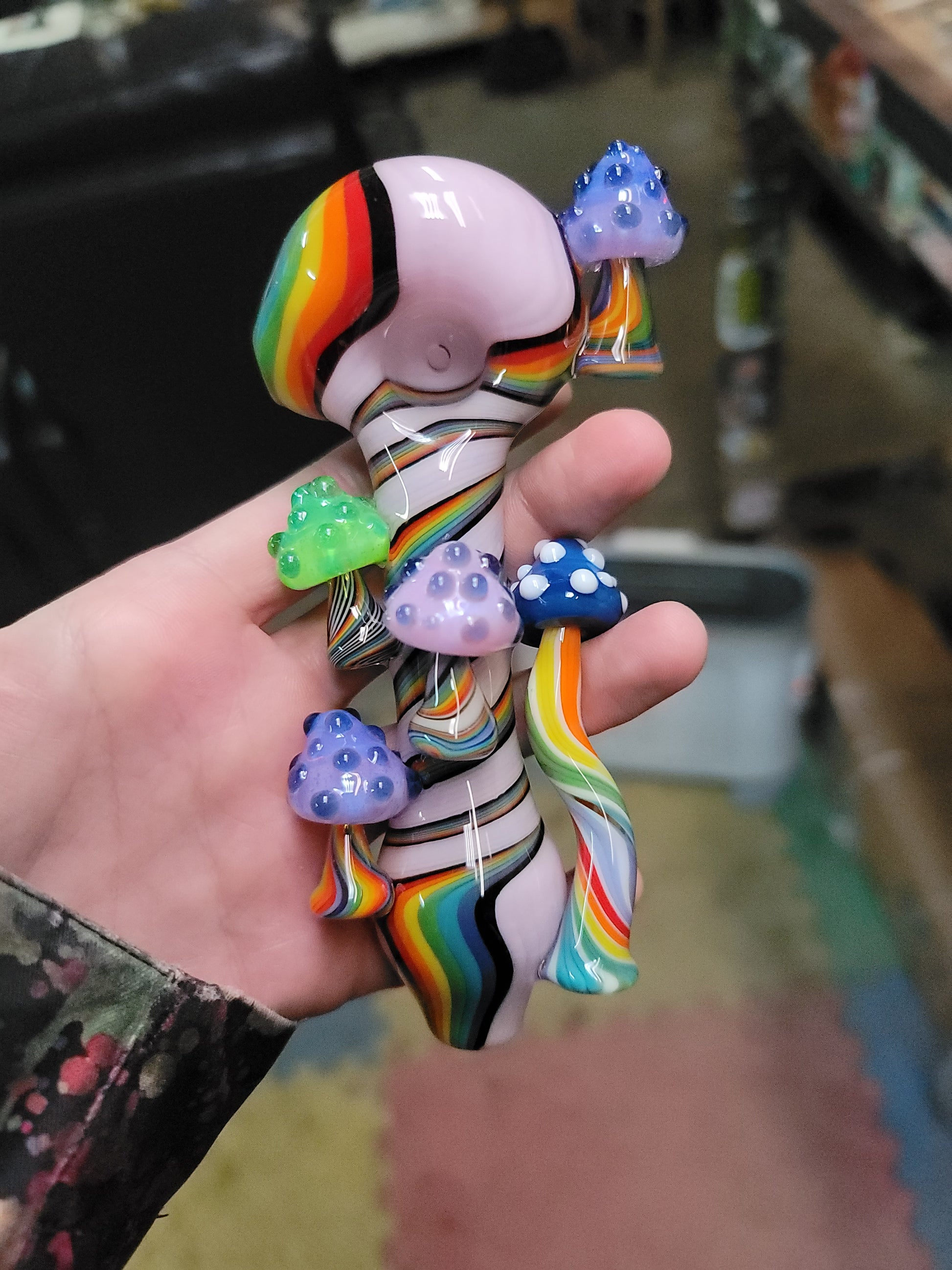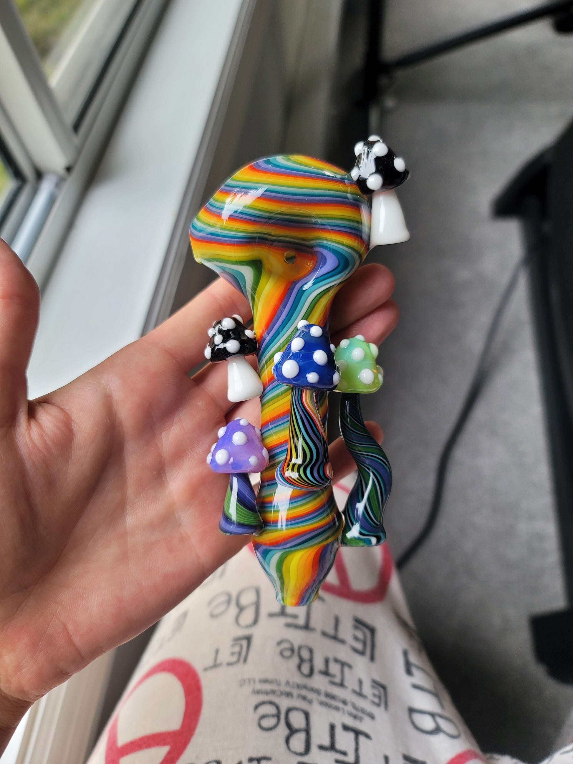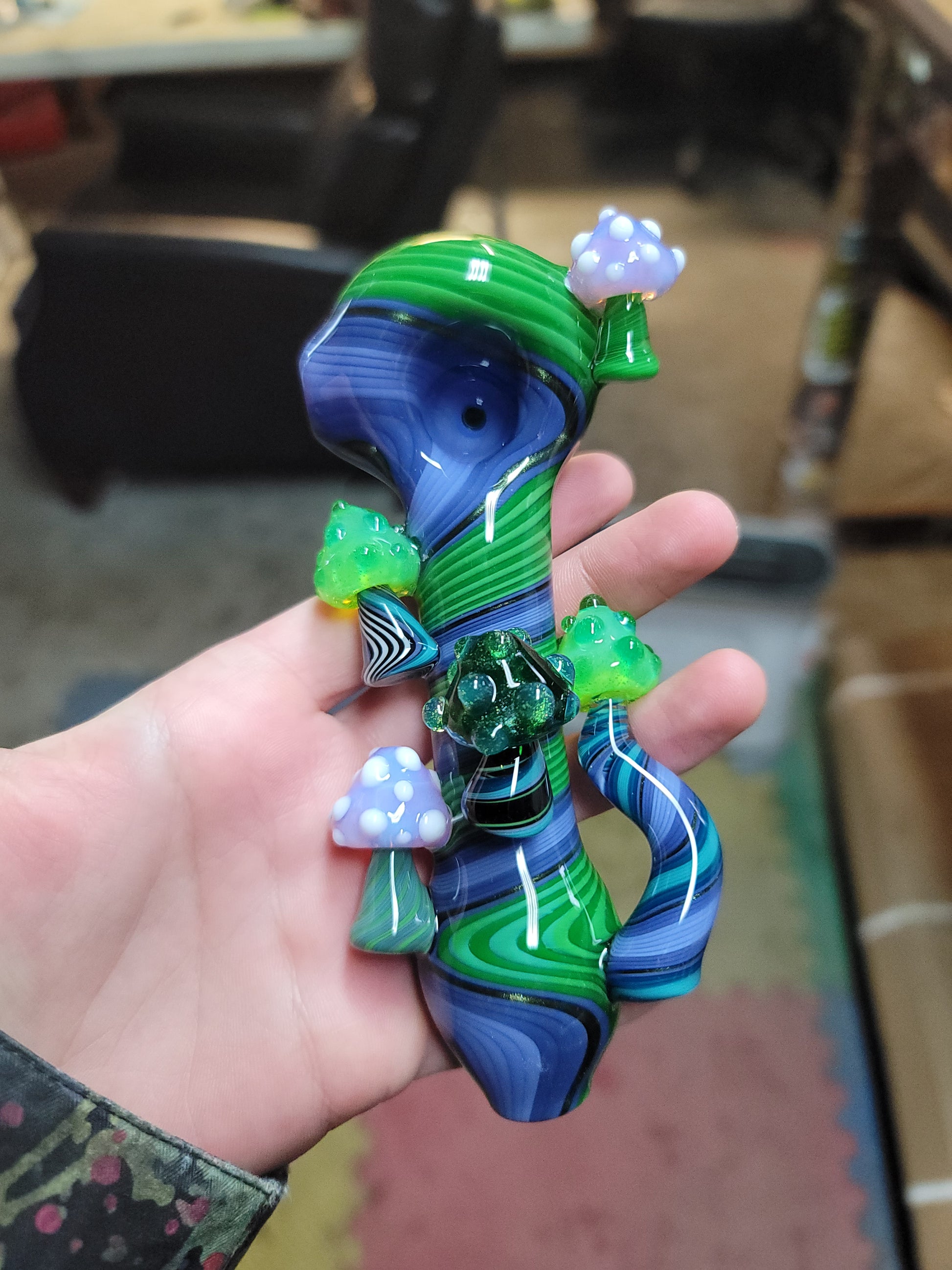One of a kind very thick hand blown glass. Made and shipped within 2 weeks of ordering. You pick the colors. Message me to discuss the colors you'd like. There's another option for 3 mushrooms.