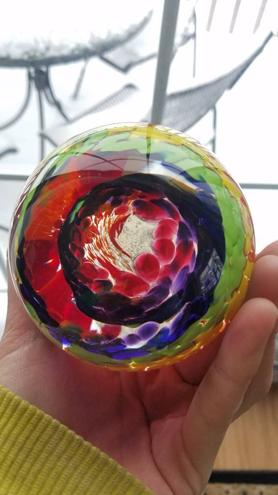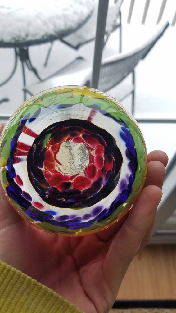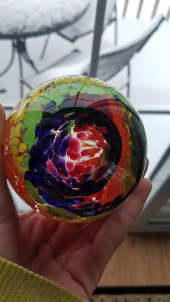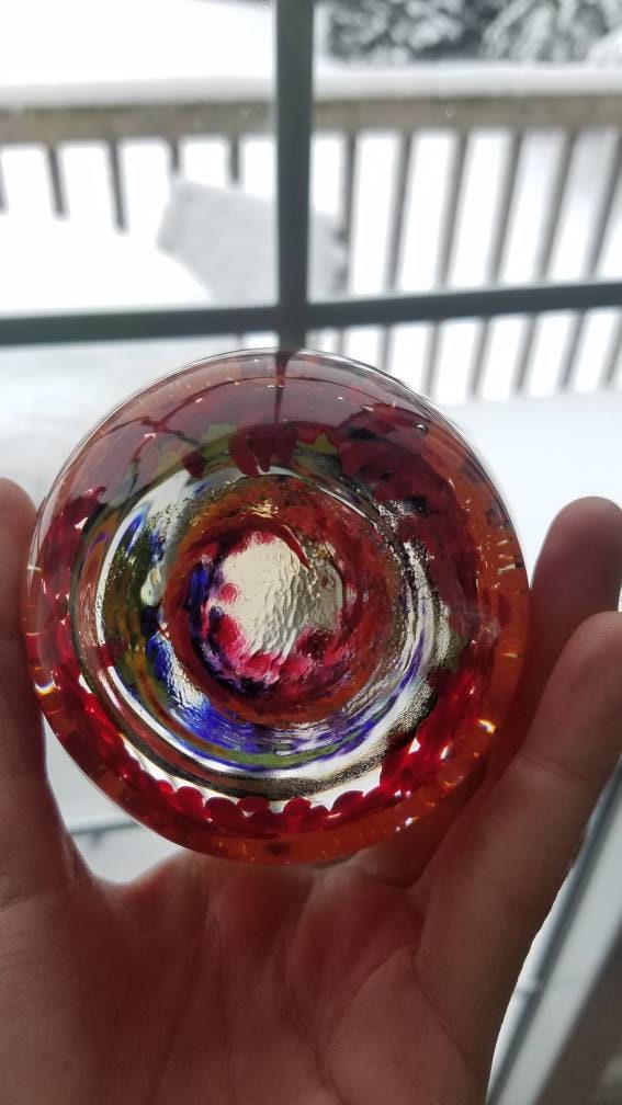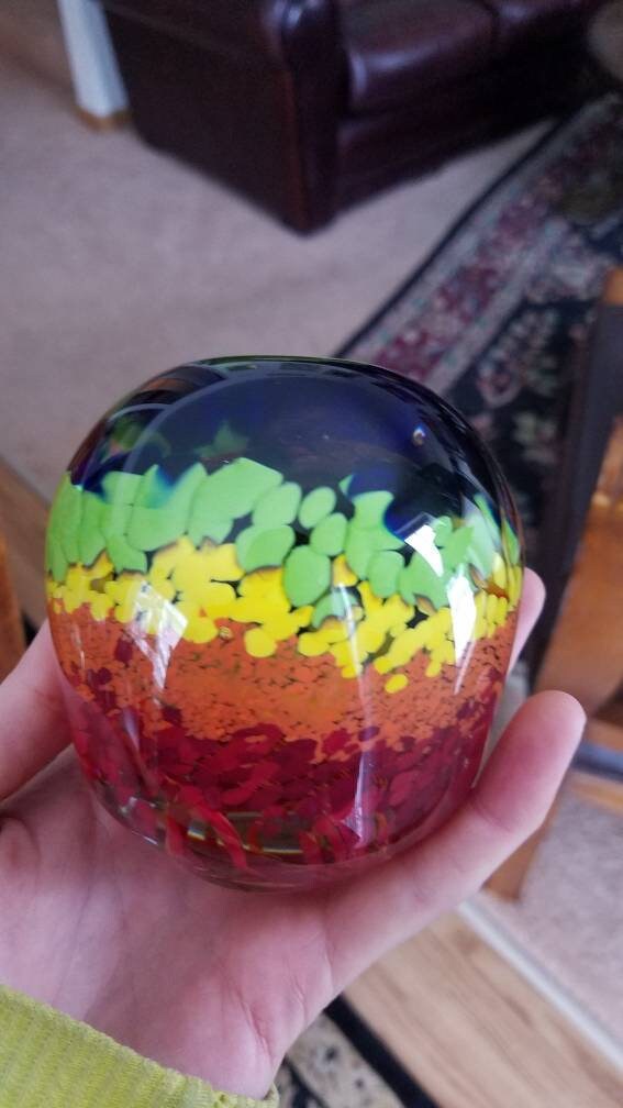 One of a kind hand blown glass. Almost 3.5" from the table to the top. About 3.5" in diameter. Perfect gift for a loved one.