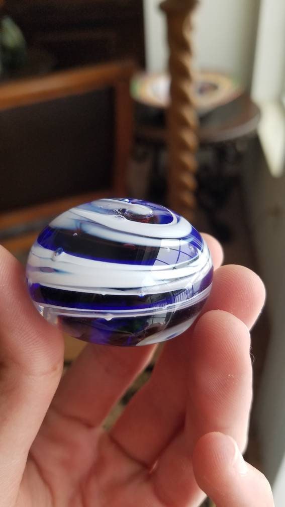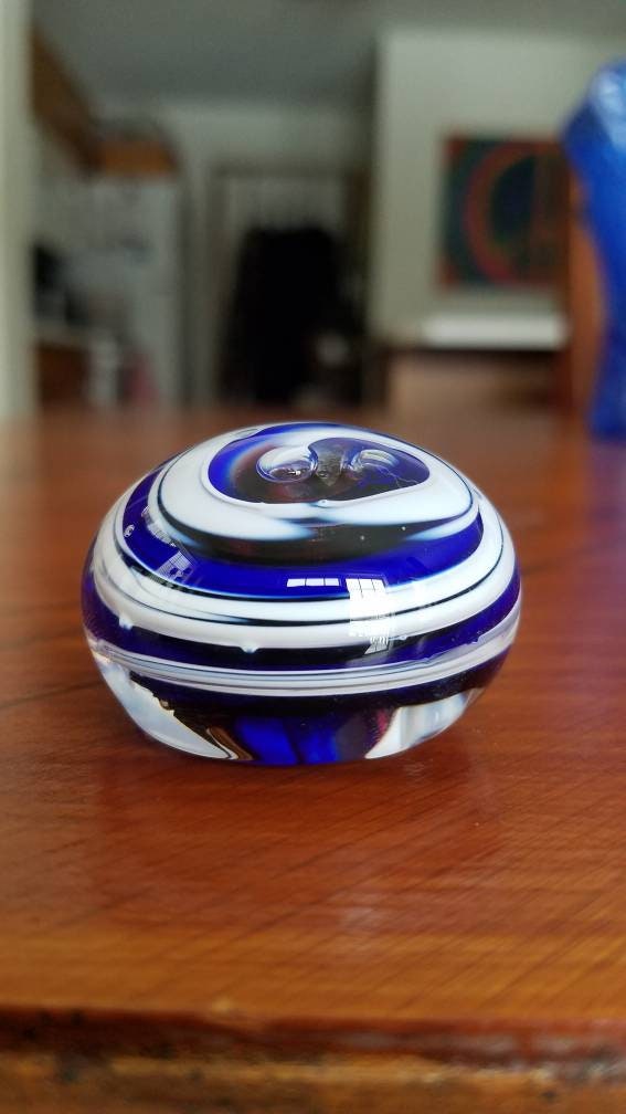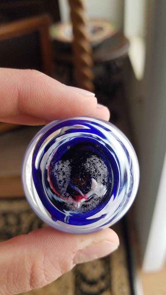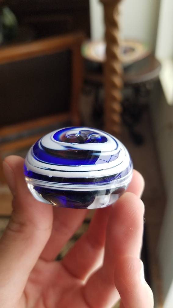 One of a kind hand blown glass. A little over 1" from the table to the top. About 1.75" in diameter. Perfect gift for a loved one.