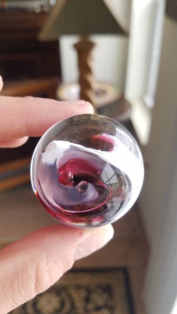 One of a kind hand blown glass. A little over 1" from the table to the top. About 1.5" in diameter. Perfect gift for a loved one.